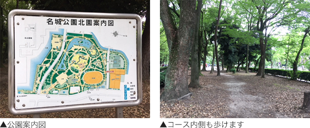 今回は利用しませんでしたが、ランニングコースは外周コース「名古屋城・名城公園散策コース(約3.5キロ)」もあります。このコース途中には、今春オープンしました、尾張名古屋のうまいものが19店舗集まった「金シャチ横丁」があります。